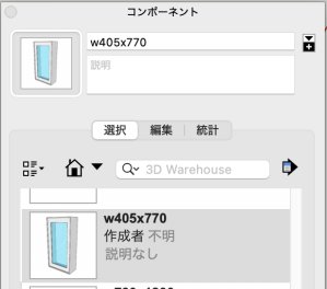 右図のように、「コンポーネント」ウィンドウでコンポーネントを選択している状態(グレーアウト)で、skpファイルをインポートするとSketchUpの画面上に表示されず、「コンポーネント」ウィンドウに追加されます。