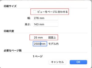 ここでは、S=1:100で印刷するため、「図面上」ボックスの「25」に100を掛けた数値「2500」を「モデル内」ボックスに入力します。